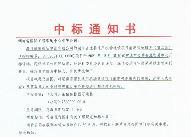 臨近歲末,捷報(bào)頻傳,省咨詢公司憑借突出的業(yè)績(jī)、雄厚的技術(shù)實(shí)力以及良好的市場(chǎng)信譽(yù),在眾多競(jìng)爭(zhēng)對(duì)手中脫穎而出,成功中標(biāo)《湖南省澧縣通用機(jī)場(chǎng)前期咨詢服務(wù)》項(xiàng)目。