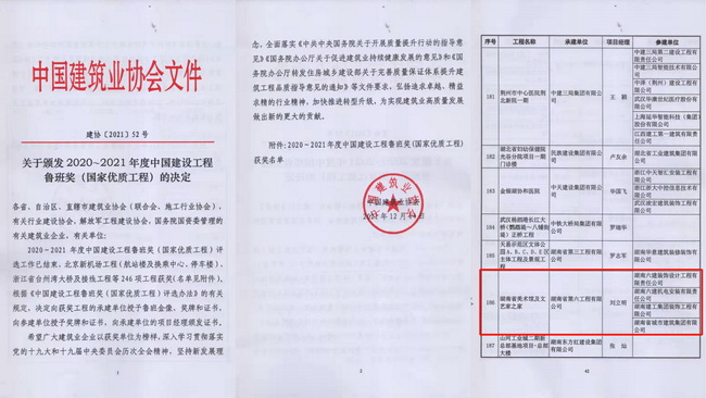 近日,中國建筑業(yè)協(xié)會公布“2020~2021年度中國建設(shè)工程魯班獎(jiǎng)(國家優(yōu)質(zhì)工程)獲獎(jiǎng)工程名單”,省咨詢公司代建的湖南省美術(shù)館項(xiàng)目、湖南文藝家之家項(xiàng)目、湖南美術(shù)館展陳裝修工程三個(gè)項(xiàng)目成功入選。據(jù)悉,這是公司代建項(xiàng)目首次榮膺此項(xiàng)殊榮,創(chuàng)造了公司代建工作新的歷史。