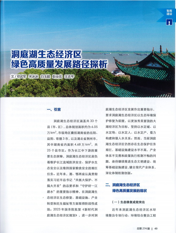 近年來,湘、鄂兩省在洞庭湖生態(tài)經(jīng)濟區(qū)生態(tài)修復(fù)、基礎(chǔ)設(shè)施、產(chǎn)業(yè)轉(zhuǎn)型和民生福祉等方面取得階段性成效。2023年2月國務(wù)院批復(fù)《新時代洞庭湖生態(tài)經(jīng)濟區(qū)規(guī)劃》,進一步對洞庭湖生態(tài)經(jīng)濟區(qū)發(fā)展作出重要指示。然而,當(dāng)前洞庭湖生態(tài)經(jīng)濟區(qū)仍然存在生態(tài)保護任務(wù)艱巨,基礎(chǔ)設(shè)施建設(shè)水平不高,產(chǎn)業(yè)體系不完善和政策執(zhí)行機制不暢的問題。本文在精準分析洞庭湖生態(tài)經(jīng)濟區(qū)發(fā)展困境的基礎(chǔ)上,從生態(tài)文明、基礎(chǔ)設(shè)施、產(chǎn)業(yè)發(fā)展、政策保障等方面探析洞庭湖生態(tài)經(jīng)濟區(qū)綠色高質(zhì)量發(fā)展路徑。