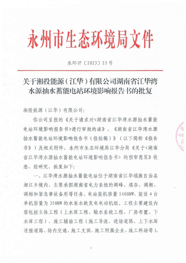 近日,我司環(huán)境保護(hù)咨詢事業(yè)部負(fù)責(zé)撰寫的《湖南省江華灣水源抽水蓄能電站環(huán)境影響報告書》,順利通過了永州市生態(tài)環(huán)境局的評審并取得批復(fù)(永環(huán)評〔2023〕23號)。