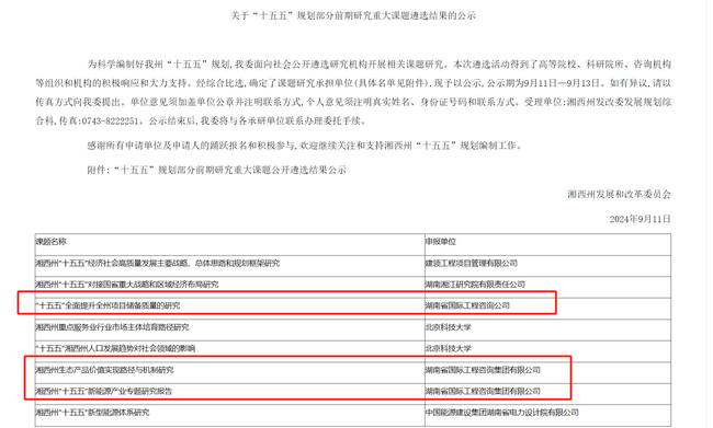近日,根據(jù)衡陽市和湘西州發(fā)展改革委“十五五”規(guī)劃前期研究重大課題遴選結(jié)果公示,湘咨集團成功中標《衡陽市優(yōu)化投資結(jié)構和提升投資效益研究》《衡陽縣域經(jīng)濟高質(zhì)量發(fā)展研究》《湘西州生態(tài)產(chǎn)品價值實現(xiàn)路徑與機制研究》《湘西州“十五五"新能源產(chǎn)業(yè)專題研究報告》《“十五五”全面提升全州項目儲備質(zhì)量的研究》等多個課題。