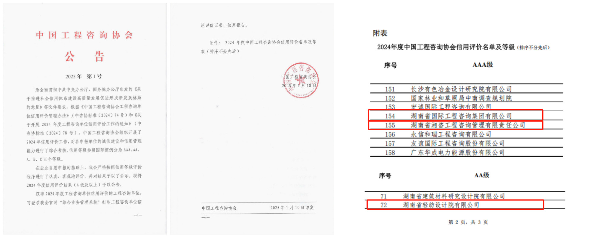 2025年1月10日,中國工程咨詢協(xié)會(下稱“中咨協(xié)”)發(fā)布2025年第1號公告,湘咨集團(tuán)成功獲評2024年工程咨詢單位信用評價等級AAA級。據(jù)省咨詢協(xié)會統(tǒng)計(jì),湖南此次共7家單位獲評AAA級,4家單位獲評AA級,其中,湘咨集團(tuán)獲評2家AAA級(本部及湘咨管理公司)、1家AA級(省輕紡院)。