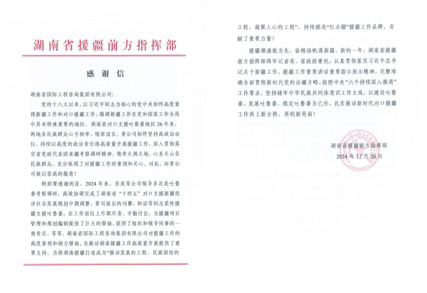 近日,湖南省援疆前方指揮部發(fā)來(lái)感謝信,對(duì)湘咨集團(tuán)及副總經(jīng)理肖亮、工作人員劉攀、陽(yáng)滔等同志在援疆工作中作出的貢獻(xiàn)表示感謝。 近年來(lái),湘咨集團(tuán)積極響應(yīng)黨中央關(guān)于援疆······
